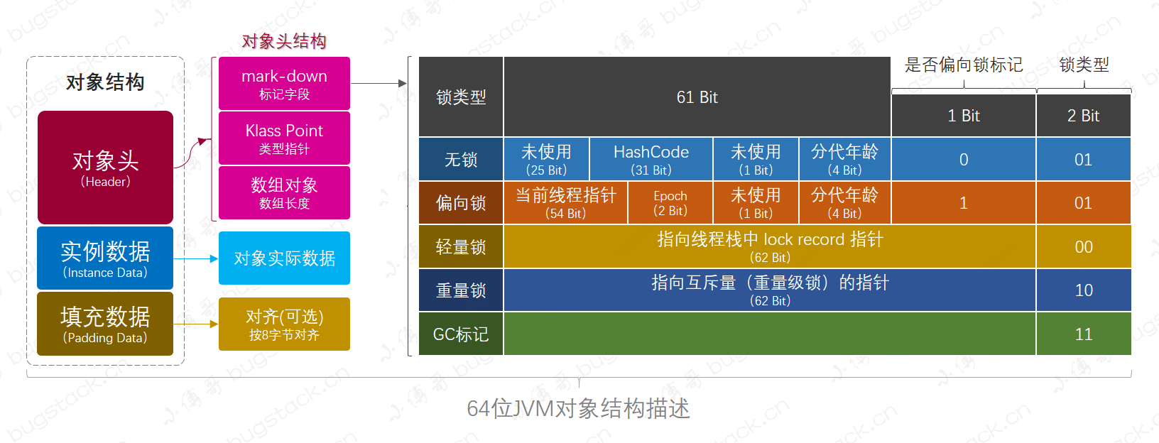 - Mark Word:对象标记字段,存储一些标记位,如哈希码、锁状态,分代年龄等