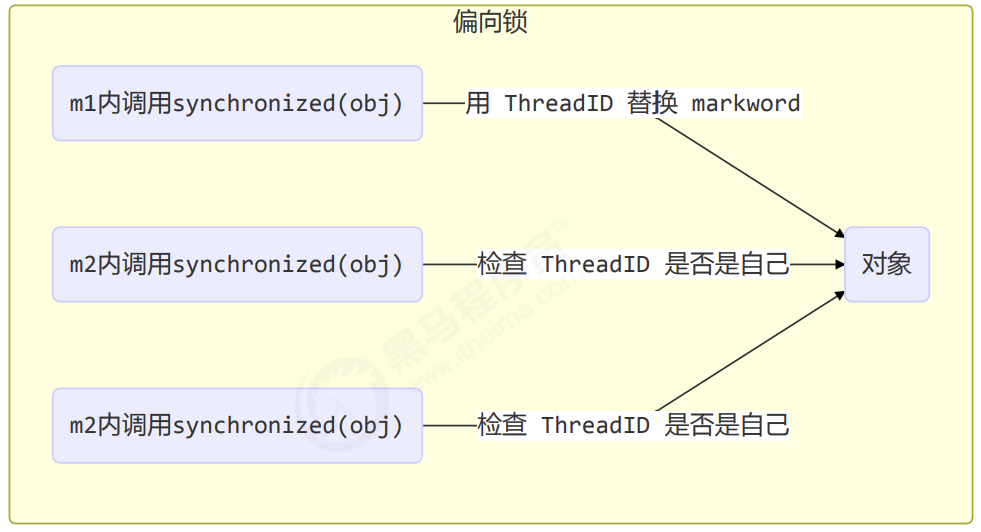 我们再退一步,如果一个共享资源竞争很少,一直由某个线程上锁,那么轻量级锁就没有必要每次都 CAS 交换 Lock Record 地址和 object 的 Mark Word 了,因此可以进一步优化:第一次上锁时使用 CAS 交换 Thread ID 和 Mark Word,后续只要校验 object 的 Mark Word 里存储的 Thread ID 仍是自己,判断没有发生竞争,这个对象就归该线程所持有,这样就仅需要一次 CAS 操作了。从机制上也能发现,偏向锁解锁后对象头里依然存储着线程 ID,并且这里的 ID 是 OS 分配的,和 Java 层面的线程ID 并不一致。。