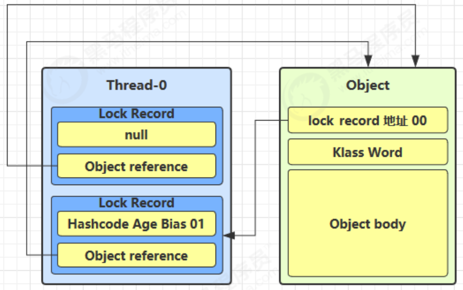 - 如果是自己已经持有 该 object 的轻量级锁,表示重入,那么会再创建一条 Lock Record 作为重入的计数器,并且该锁记录的地址字段为 null