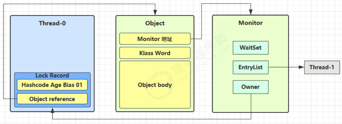 JVM 中的每个对象都会关联一个 Monitor 监视器,或者叫管程,一旦某个线程使用 synchronized 给对象上锁(重量级锁),该对象的 Mark Word 中就会记录下对应的 Monitor 指针,同时 Monitor 对象内部的 Owner 字段也会设置为该线程,就像图中的 Thead-2。