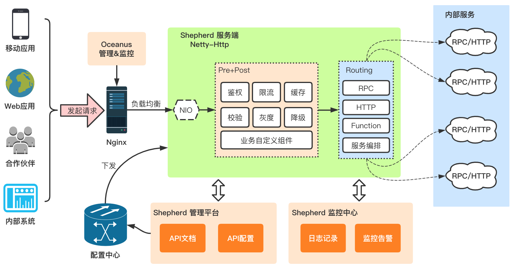 Shepherd是一个高性能、高可用、易扩展的API网关,可以通过配置的方式,对外开放数据和能力,提供 API 完整生命周期的管理,包括API的创建,维护,发布和下线等,并提供鉴权认证、流量管控、熔断降级、数据缓存、流量路由等基础功能。 我们组业务一般用 Shepherd 管理 M端的HTTP接口,而C端接口在API层的处理逻辑特别复杂,需要很多定制化的实现,因此没有接入 Shepherd。