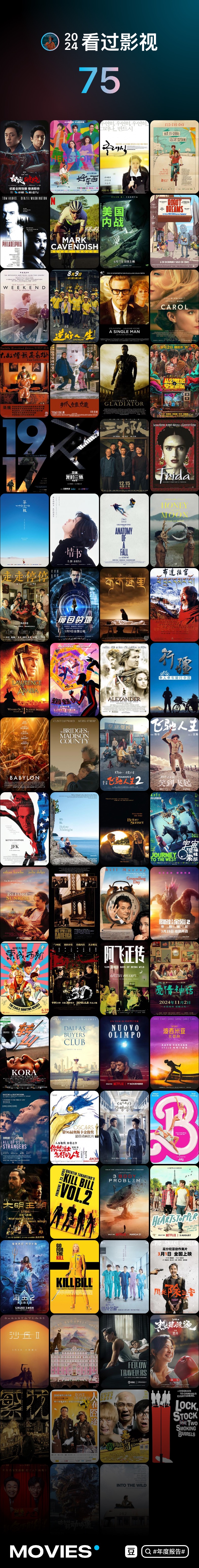 影视今年一共 75 部,今年最喜欢的是《热辣滚烫》,想到了自己减肥的那段时光,有被共情到,看的老子哇啦哇啦的,贾玲的两部作品,每一部都狠狠触动我的感情。还有《繁华》,老胡还是帅啊。2025 年尽量继续一周一部,但比较难,周末一有事就顾不上了。