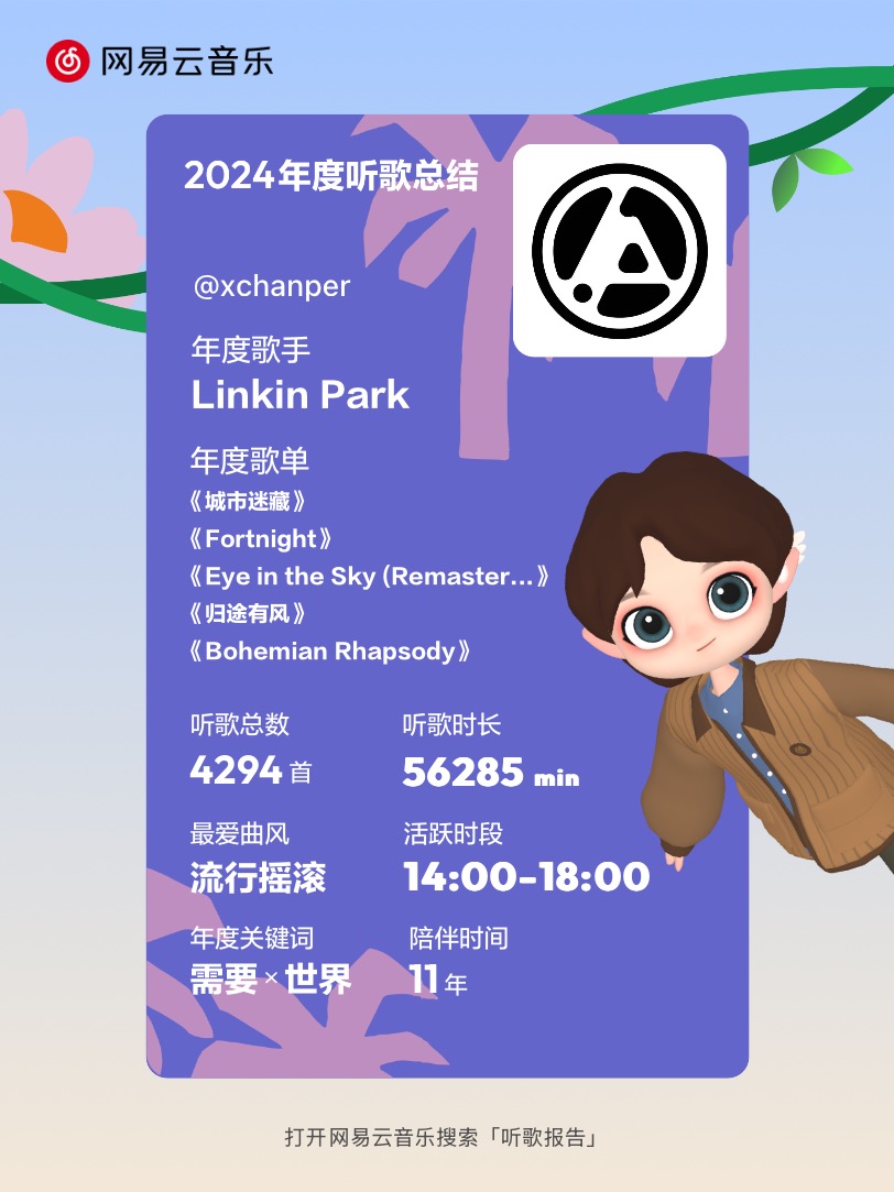 今年去了两次 livehouse,现场的氛围果然还是不一样,而且能听乐手创造出一些即兴的演奏,希望明年能去一次音乐节。年度歌手时隔 4 年,再次回到 Linkin Park,应该单纯是歌单里他们的歌最多。