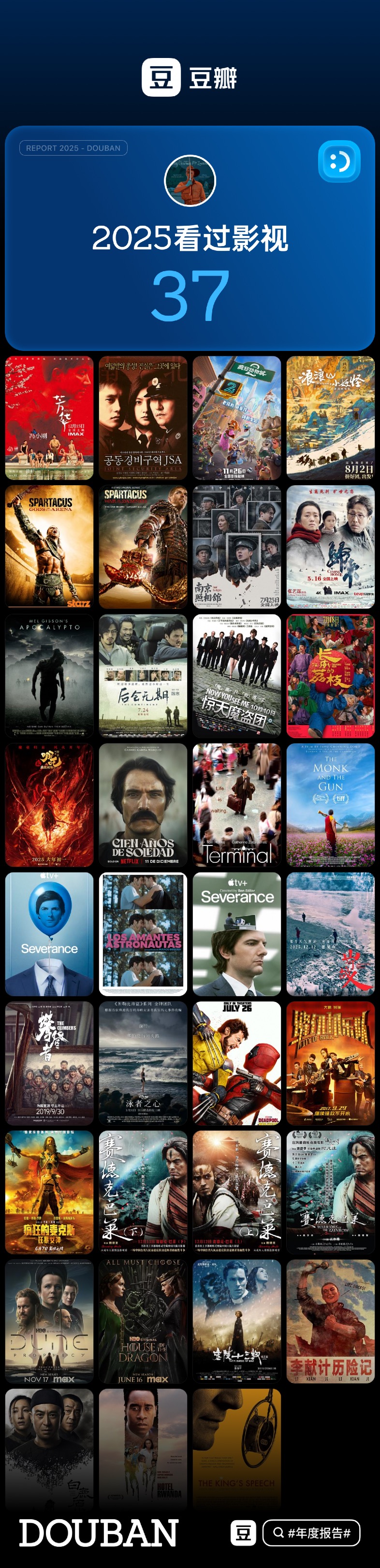 影视今年一共 37部,对比去年的 75 部,缩减了一半。。。哎,上班太忙,周末休息更多得只想躺着。不过 B 站视频还是看的挺多的,特别是有的博主动辄两小时的长视频,信息摄入量倒是不亚于看书和电影。