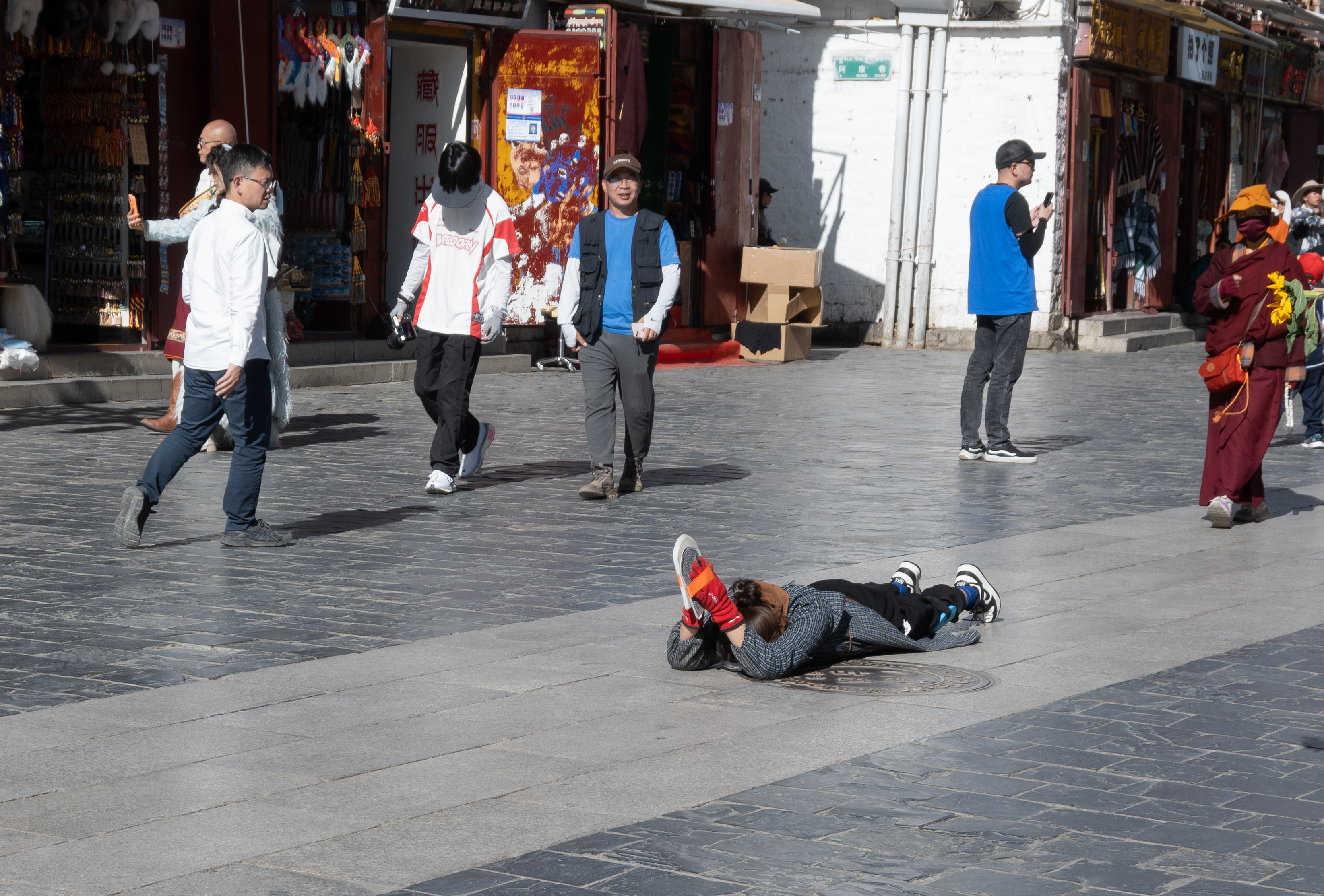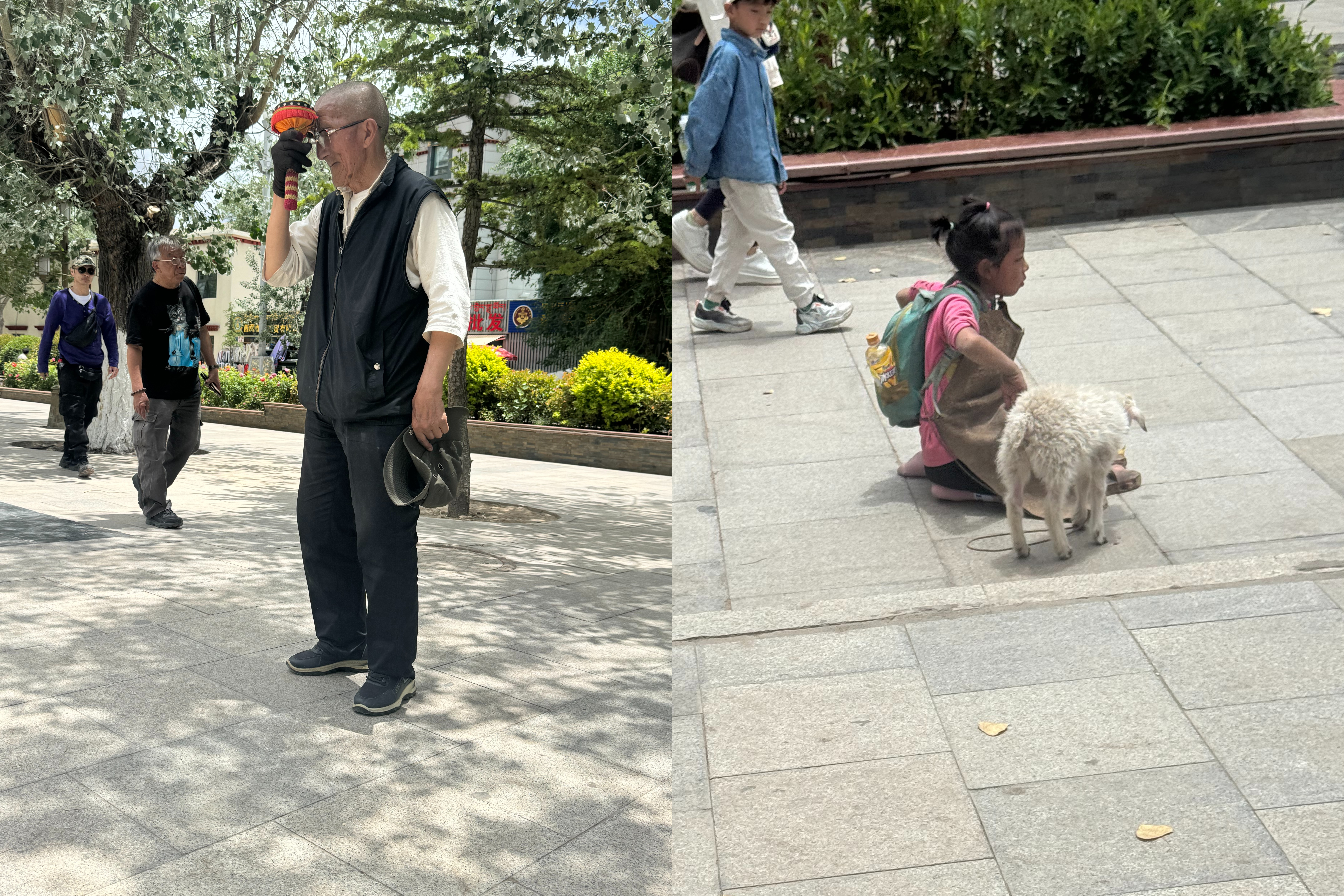 睡了一觉,高反好了很多,但也不能说舒服,鼻孔慢慢开始出血,嘴唇渐渐发黑。在西藏这片土地,生存确实不易。早上在路边吃了顿四川人开的“麻辣牛肉面”,正好是周三,我们就去了扎基寺“求财”。早上十点多,寺外已经排起了长队,队伍的另一边坐着一些乞讨的妇人和儿童。在拉萨,乞讨者随处可见。