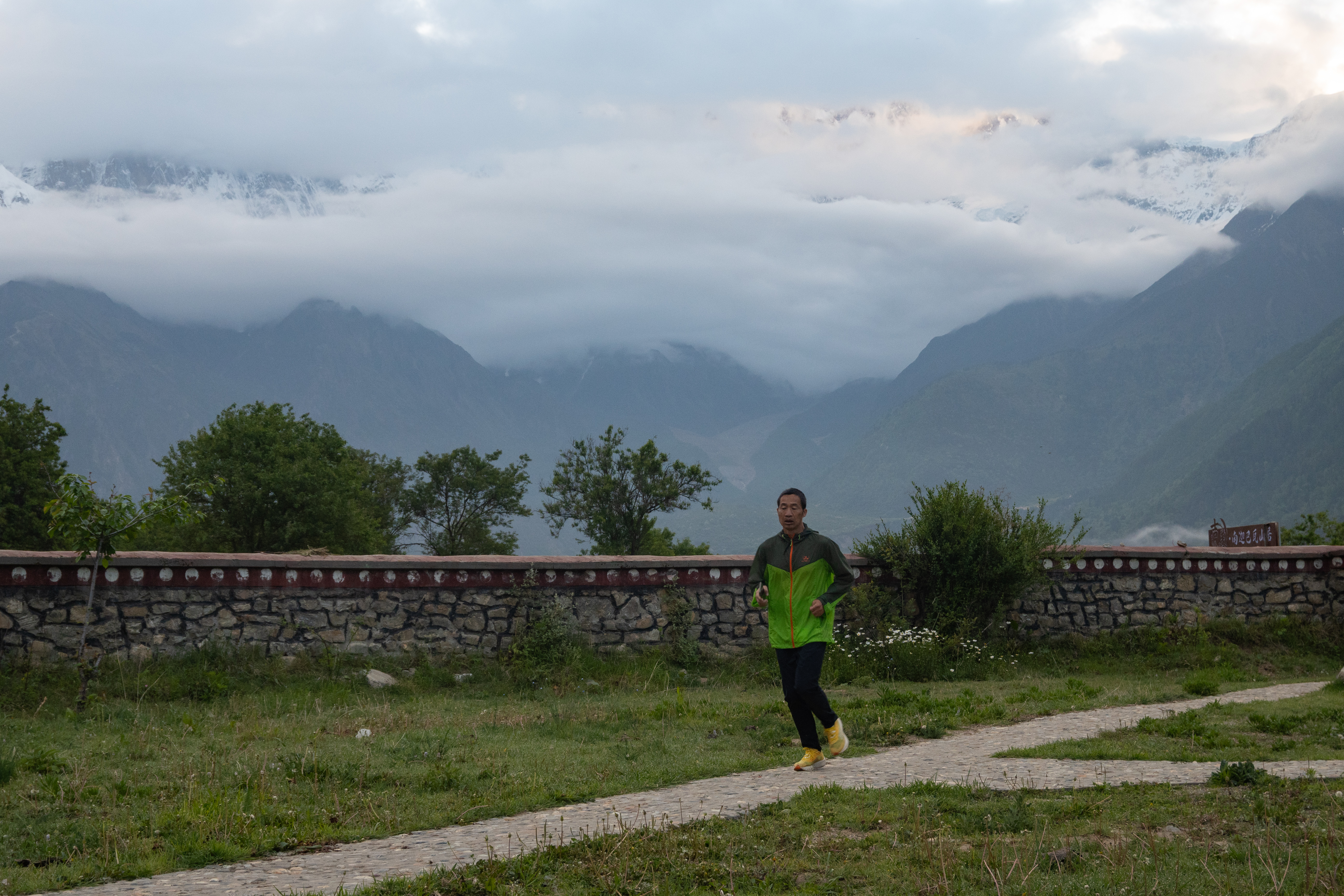 为了看南迦巴瓦的日出,6点钟就醒了,憨憨FY叫不醒,我就一个人跑出去坐在秋千上等待日出,可惜云雾太多,放弃回去接着睡了,路上看到一个大哥在雪山下晨跑。