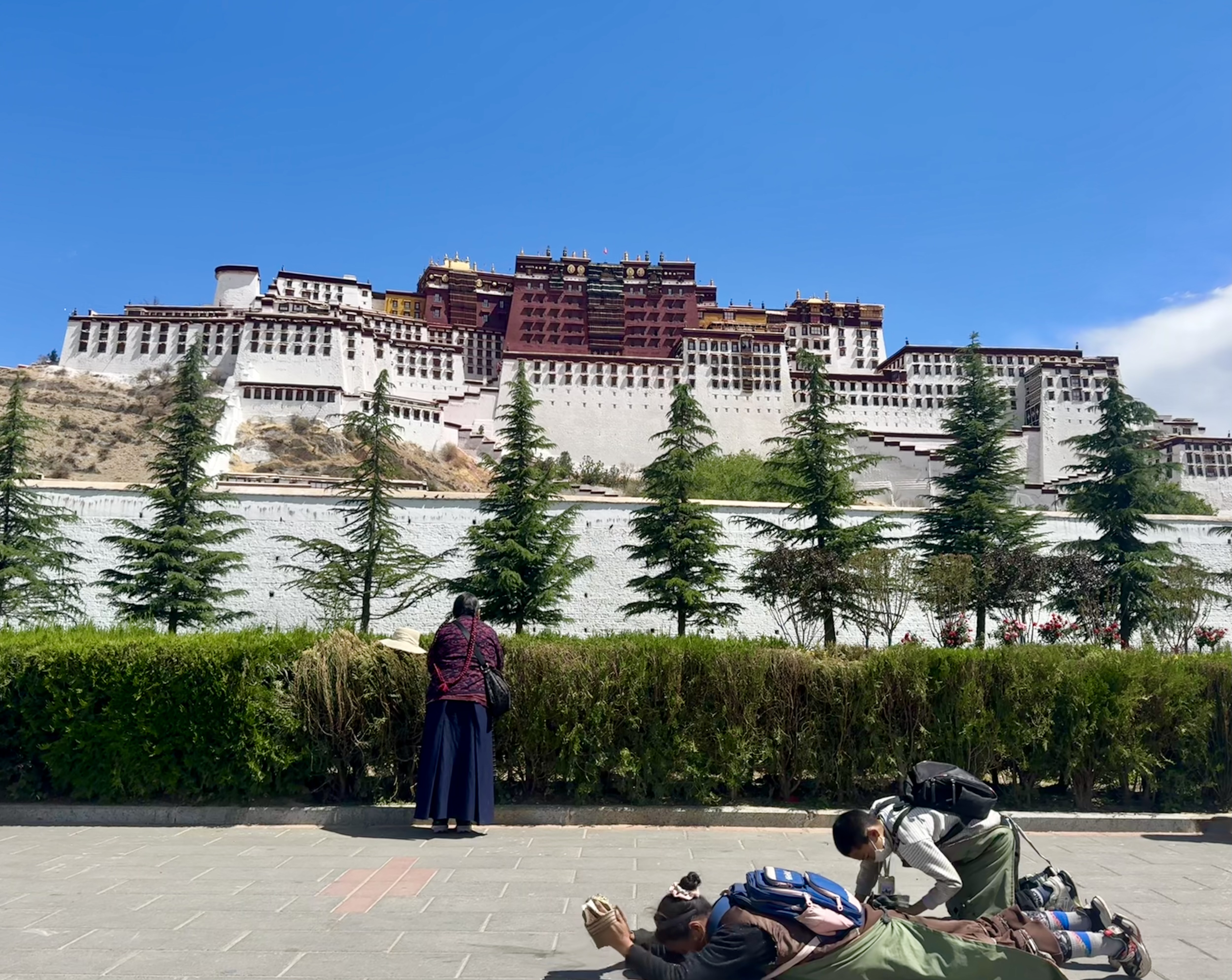 参观完后我们坐在出口的树荫下休息,看着男男女女、老老少少的信徒绕着布达拉宫磕长头、朝拜,思绪万千。