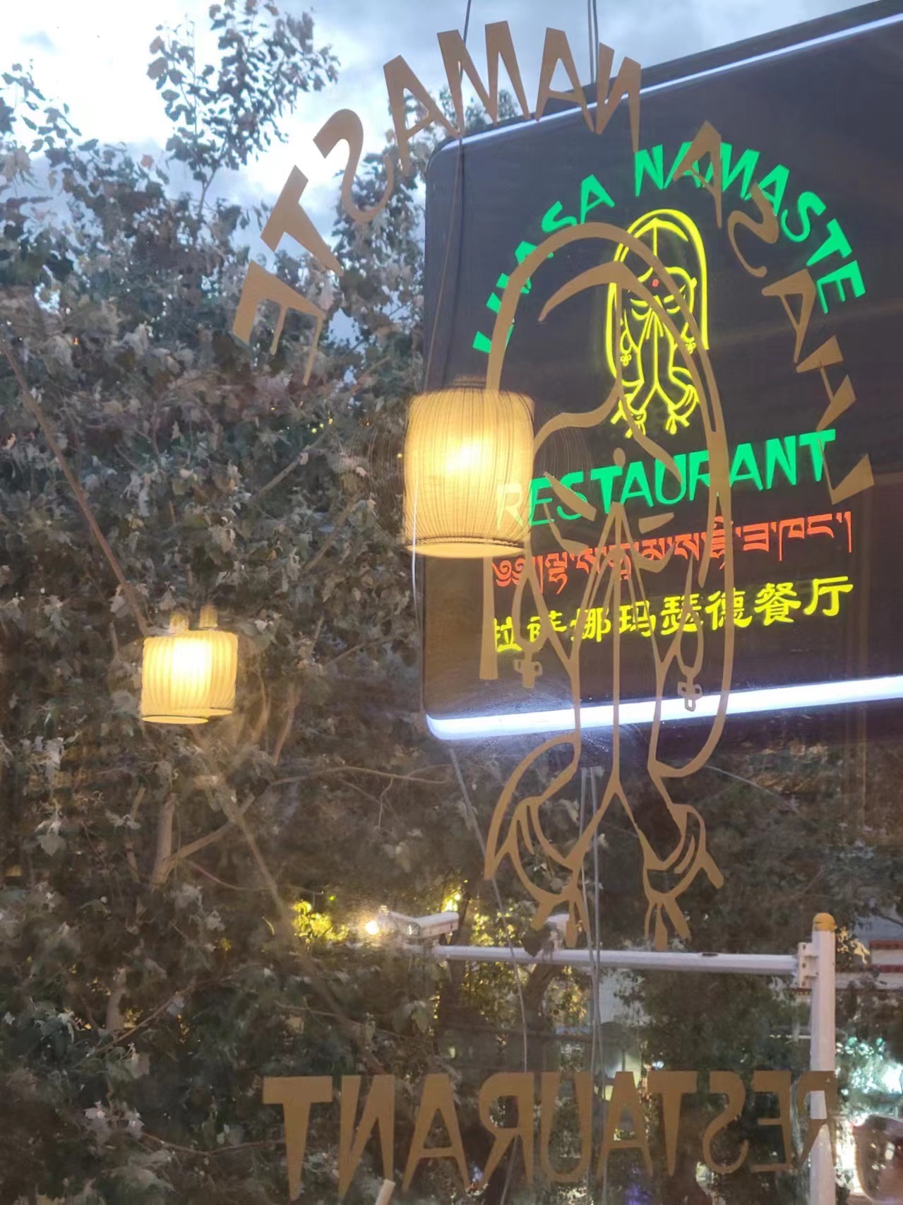 这一天到这还没结束,晚上我们和WJ、WY、XX三人又约了一起去汪师傅推荐的娜玛瑟德餐厅吃了顿饭,这家餐厅很丰富,既有藏餐,也有西餐、尼泊尔餐、印度餐等等,有个服务员小哥就是尼泊尔人,在一旁服务四个德国人。中途还偶遇了同车的黄毛姐姐。在娜玛瑟德终于吃到了糌粑,一瞬间感觉和小时候吃的某种东西味道口感一摸一样,但是记不得是什么了。吃完我们五人散步到布达拉宫广场就散了。
