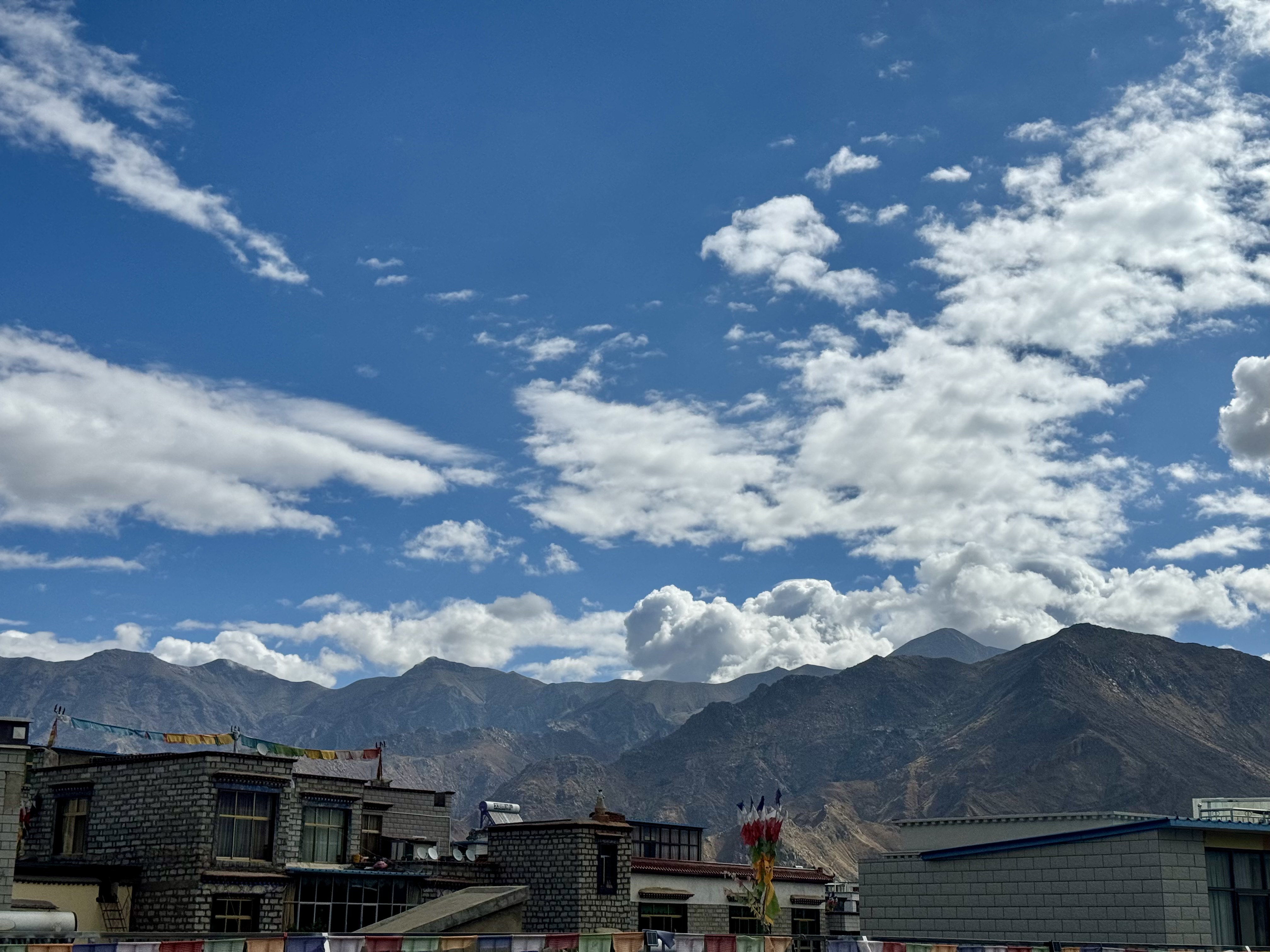 一下火车,就感觉到空气的稀薄,呼吸都要很大一口才能让心脏满意,雪域高原,名不虚传。拉萨作为西藏的首府,也是被群山环绕着,城中肉眼可见高耸的光秃秃的大山,建筑风格以白色为主,房顶到处飘扬着经幡。我们坐公交(支持交通联合好评)前往酒店,路上见到了红山上的宫殿,传说中的布达拉宫,拉萨城区确实不发达,不过布达拉宫和大昭寺附近也是人头攒动,和国内的三线城市差不多吧。在公交上,有种很奇妙的感觉,在拉萨这座城市,我一个汉族人才是少数民族,他们说的话我听不懂,举止谈吐也和内地很不一样。