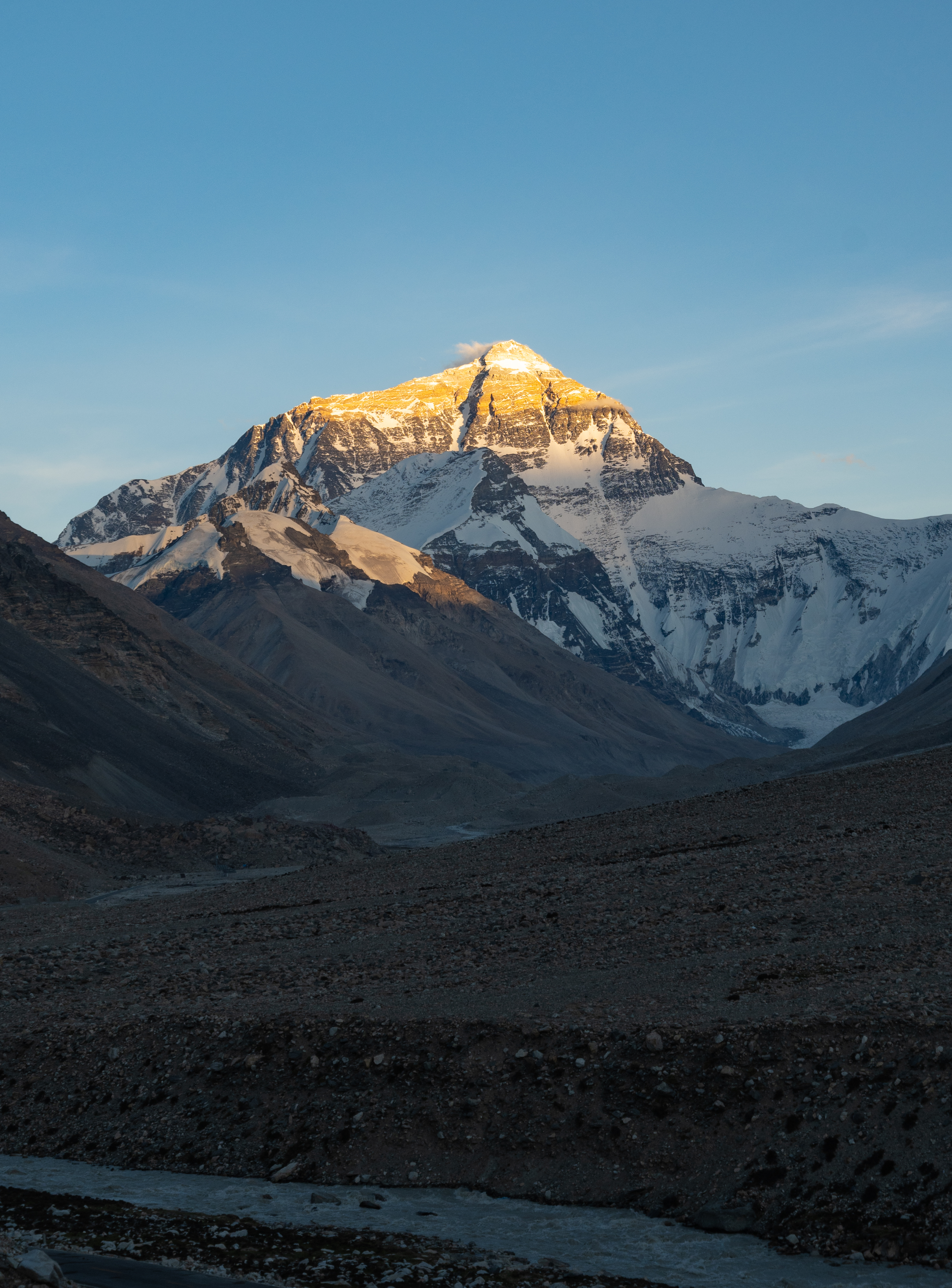 又沿着盘山公路拐啊拐,我们到了景区门口换乘环保车,继续坐车1个小时到达了珠峰大本营,近距离看到了世界最高峰——珠穆朗玛峰!然后由于太冷,打卡完高程碑我们就躲到了超市取暖,真的好冷啊。然后一直到8点多,看到WJ她们的消息,我们立刻跑出去开始一顿狂拍日照珠峰。听师傅说,以前珠峰大本营离珠峰还要更近,这几年由于环境问题又后撤了几十公里。其实从山形上,珠峰并不是最美的,更多的在于它的世界第一高的意义,世人都知道世界第一高是珠穆朗玛峰,但很少人知道世界第二高峰——乔戈里峰就在我国新疆。